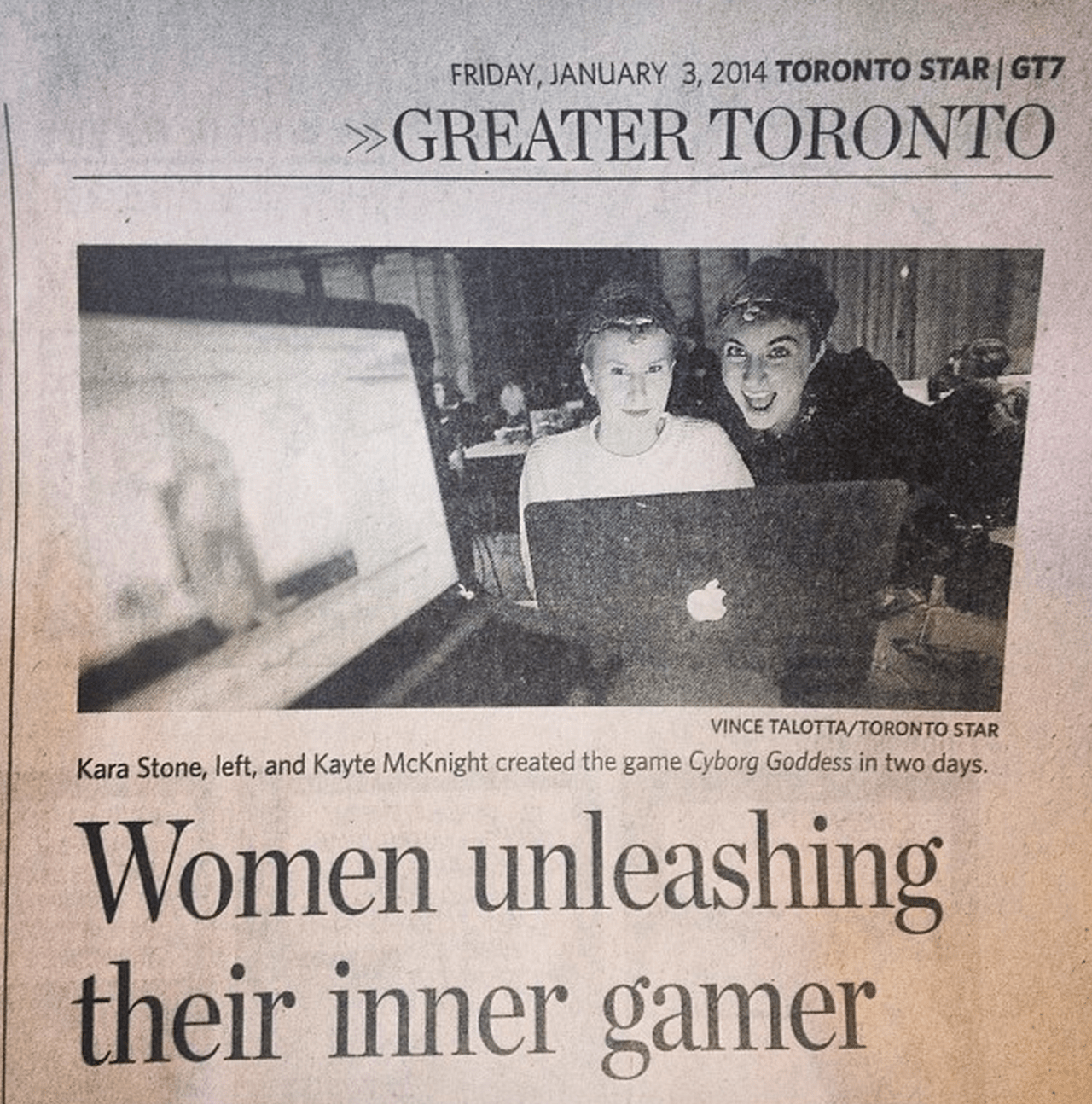 Cyborg Goddess in the Toronto Star Date: January 4, 2014Author: karastone Category: media Tags: cyborg, dames making games, feminism, game dev, goddess, jasbir puar, media, toronto, video games, videogames, women, women in gaming Post navigation ← Hand to Heart Art Gallery of Ontario 1st Thursday → Dames Making Games organization helps women make video games Article by Kim Nursall http://www.thestar.com/news/gta/2014/01/02/dames_making_games_organization_helps_women_make_video_games.html Share this: Click to share on X (Opens in new window) X Click to share on Facebook (Opens in new window) Facebook Like Loading... Related