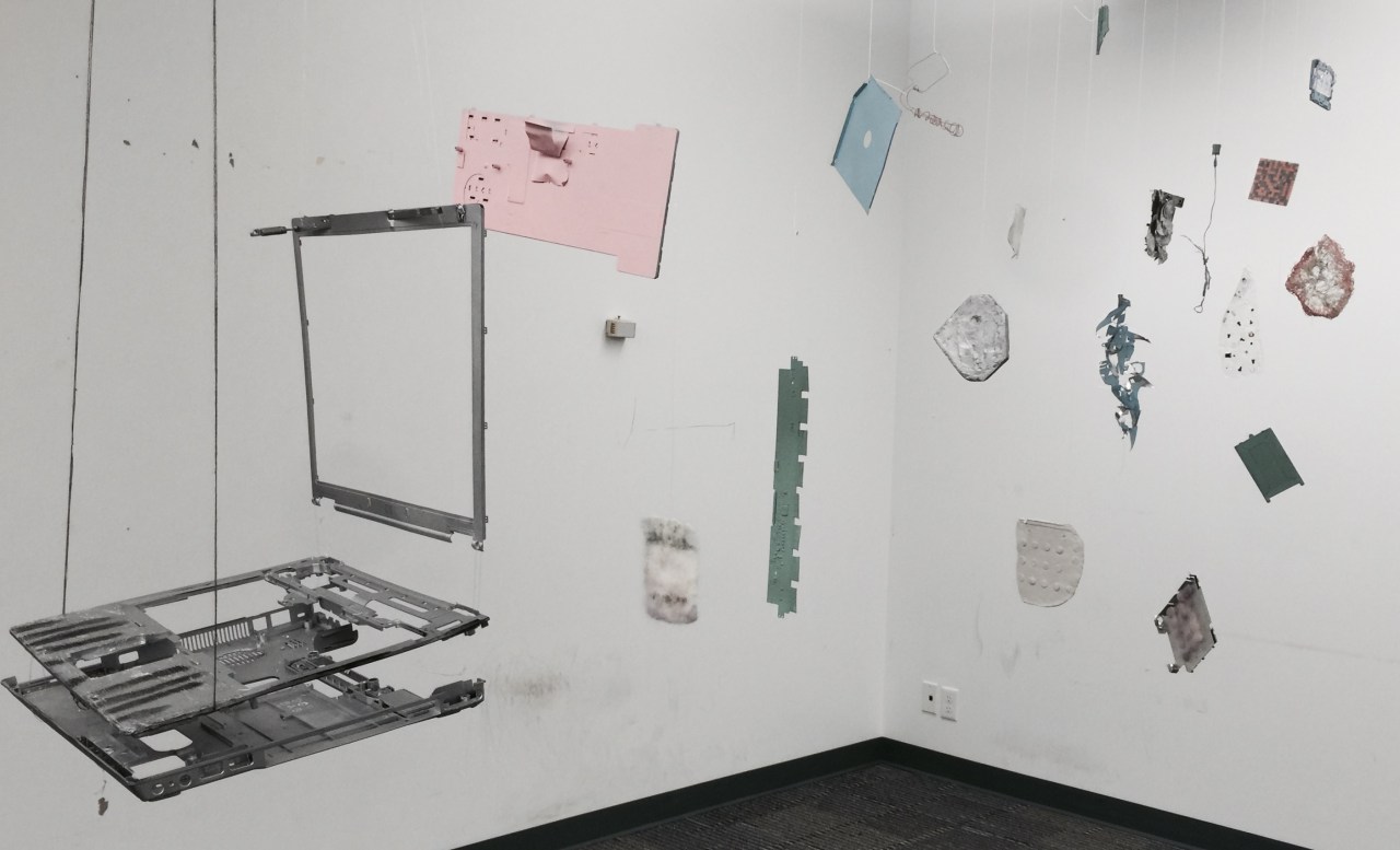 Live Among Ghosts is an installation piece created from deconstructing and recrafting an old computer. We took an old broken laptop that we ripped apart into its smallest pieces and spray painted, created molds, wove and sewed soft materials and hung it from the ceiling. The empty screen frames hang on either side, 1 of the computer and 1 totally crafted. They act as a proximity sensors so two people at either side can control different tracks consisting of machinery sounds, recordings of Ada Lovelace and Charles Babbage’s Analytical Engine, sewing machines, looms at work, women’s chatting voices while weaving, with the sound of women’s breathing throughout. We created it in hopes to interrogate the common dichotomies of craft and technology, masculine and feminine, future and past, material and immaterial.